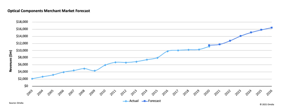 Vallo concluded by offering a revenue growth forecast made by Yole last year, which stated that the revenue of Datacom optics reached around $5.3bn in 2020 and the firm predicts that it will reach around $15bn in 2026, and more than $28bn in 2032.