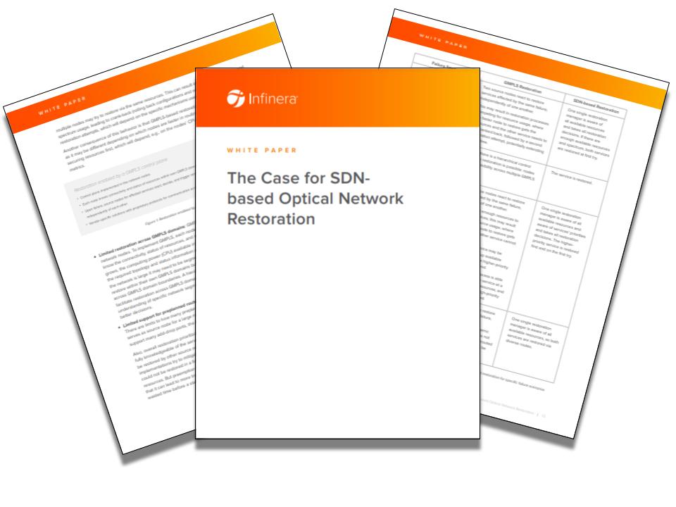 Read the latest White Paper from Infinera to find out in more technical detail about this improved approach to optical network restoration, based on an SDN control plane. This approach aligns with current networking trends, including IP traffic offloading from the OTN layer, adoption of network layer disaggregation, and increased network automation.