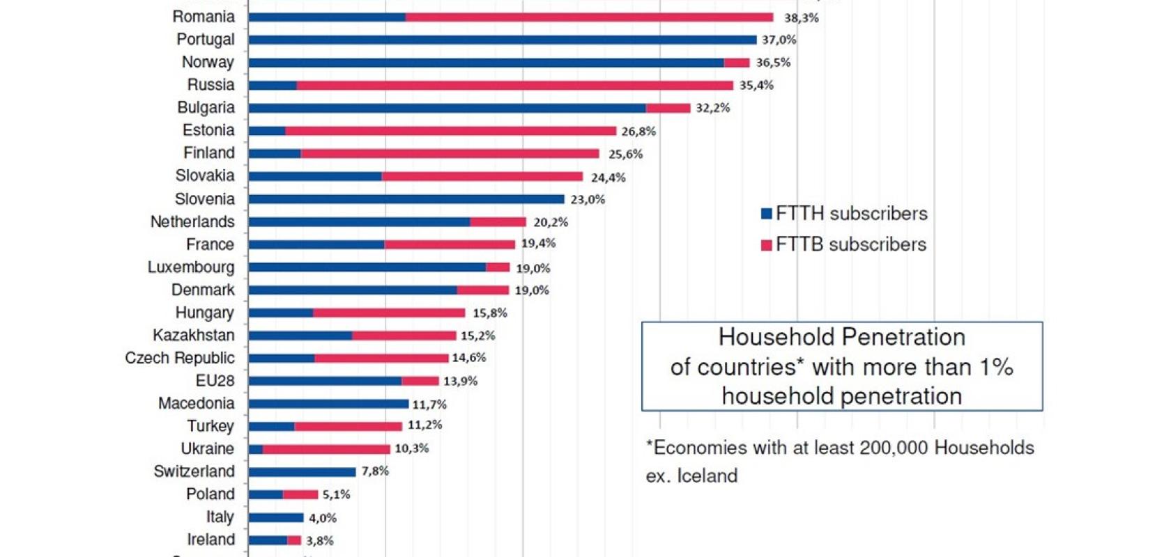 In terms of European FTTH penetration Latvia remains in the lead of the rankings for the third year running, with 50.3 per cent, followed by Lithuania (46.9 per cent). Spain takes third place with 44 per cent. The UK made its debut with a penetration rate of 1.3 per cent and a take-up rate of 13.1 per cent. FTTH/B subscriptions grew by 83 per cent compared to September 2017 for a total of 369,250 subscribers, and its FTTH/B Homes passed by 22.8 per cent reaching 2,817,000 homes passed. This was largely attributed to UK regulator, Ofcom promoting investments in FTTH/B across the country.